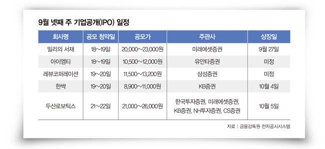 전자책 구독서비스 플랫폼 밀리의 서재는 몸값을 낮춰 코스닥 시장에 재도전한다. KT 손자회사 지니뮤직이 최대주주인 밀리의 서재는 지난해 9월 IPO를 추진했으나 투자시장이 침체되자 상장을 철회했다. 이번에는 공모 희망가를 기존 2만1500~2만5000원에서 2만~2만3000원으로 낮추고 유통 물량을 줄여 재도전에 나섰다. 밀리의 서재는 이번 상장을 통해 총 300억~345억 원 자금을 확보할 전망이다. 이 자금 대부분을 콘텐츠 개발에 사용한다는 계획이다. 서영택 밀리의 서재 대표는 9월 12일 서울 영등포구 63컨벤션센터에서 열린 IPO 기자 간담회에서 "단순 전자책 구독서비스 플랫폼에서 '참여형 IP(지식재산권) 플랫폼'으로 도약할 것"이라며 "이를 위해 작가와 독자 참여형 출간 플랫폼을 통한 오리지널 IP 확보는 물론, 작가와 독자 간 상호 소통이 가능한 출간 플랫폼도 운영할 계획"이라고 설명했다. 밀리의 서재는 지난해 매출 458억 원과 영업이익 42억 원을 달성하며 흑자 전환에 성공했다. 올해 상반기에는 매출 260억 원, 영업이익 50억 원을 기록해 IPO 기대감을 높이고 있다. 다만 밀리의 서재는 상장 이후 최대주주 지니뮤직의 보호예수 기간이 6개월로 설정돼 이 물량에 대한 부담이 있다. 나승두 SK증권 연구원은 "상장 직후 유통 가능 주식 비중은 약 25% 수준이며 대주주 보호예수 기간은 비슷한 시기에 상장을 준비하는 기업과 비교하면 짧은 것이 사실"이라며 "하지만 확실하게 실적이 턴어라운드했다는 점에서 매력적"이라고 분석했다.아이엠티와 한싹, 레뷰코퍼레이션도 주목할 만하다는 평가를 받는다. 2020년 설립된 반도체 장비 업체 아이엠티는 고대역폭메모리(HBM)용 건식 세정 장비와 극자외선(EUV) 마스크 레이저 베이킹 장비 등 반도체 핵심 장비를 생산한다. 한싹은 망연계 보안 전문기업이다. 망연계는 보안 수준이 서로 다른 망분리 환경에서 보안영역과 비보안영역 사이 데이터 전송을 위한 게이트웨이 역할을 하는 기술이다. 레뷰코퍼레이션은 인플루언서 회원 110만 명의 마케팅 활동을 국내외 기업과 연결해주는 서비스를 제공한다.
