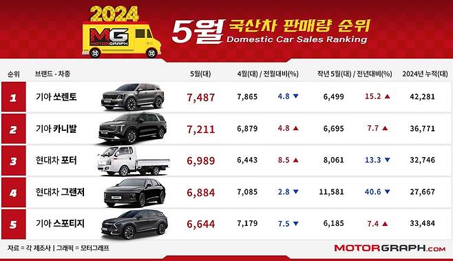 9월 국산차 판매량 집계 결과, 쏘렌토는 전월 대비 무려 37.5%나 급증한 8,978대를 기록하며 국산차 판매 1위에 복귀했다. 8월 1위를 차지했던 현대 아반떼는 7,675대로 2위에 머물렀다. 아반떼가 전월 대비 거의 제자리걸음을 한 반면, 쏘렌토는 무려 2,447대나 더 팔리며 격차를 벌렸다. 3위는 기아 카니발이 6,758대로 자리했고, 같은 기아의 스포티지가 6,416대로 4위를 기록하며 기아차의 SUV 라인업 강세가 두드러졌다.
