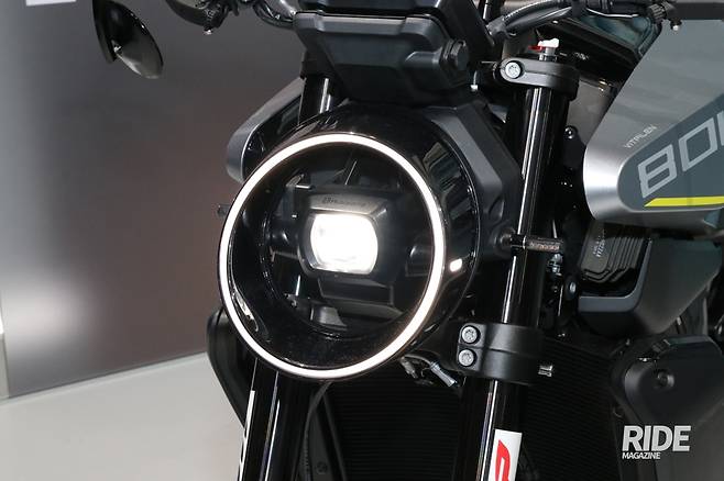 개성 넘치는 디자인으로 많은 사랑을 받고 있는 허스크바나가 신형 비트필렌 801을 통해 또 한번 파격적인 디자인을 선보여 주목받았다. 뭐니뭐니해도 외관에서 가장 눈에 띄는 건 헤드램프 부분이다. 보통 헤드램프를 구성하는 헤드라이트와 주간주행등은 한 덩어리의 구조로 만들어지는 것이 일반적인데, 비트필렌 801에 적용된 Bi-LED 프로젝터 렌즈 헤드라이트는 이런 관념을 깨고 헤드램프와 독립된 라이트링을 통해 독특한 전면 모습을 완성했다. 실제 전시장에서도 독특한 헤드램프의 구성을 직접 만져보는 사람들이 가득했을 정도.