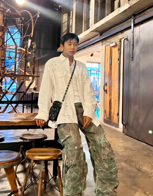사진 속 그는 여유로운 실루엣의 화이트 셔츠를 선택해 전체적인 룩에 깨끗하고 깔끔한 분위기를 더했다.