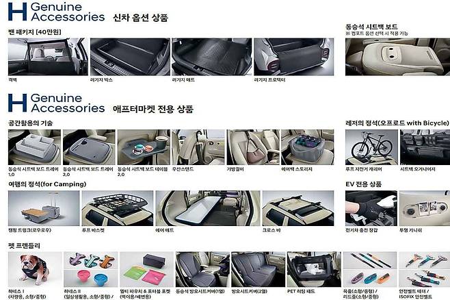 이외에도 화물 적재에 최적화 된 밴 패키지(40만원)과 레저, 반려동물, 여행에 특화된 에프터마켓 전용 상품도 있어 소비자의 취향에 맞는 선택폭이 굉장히 넓다.