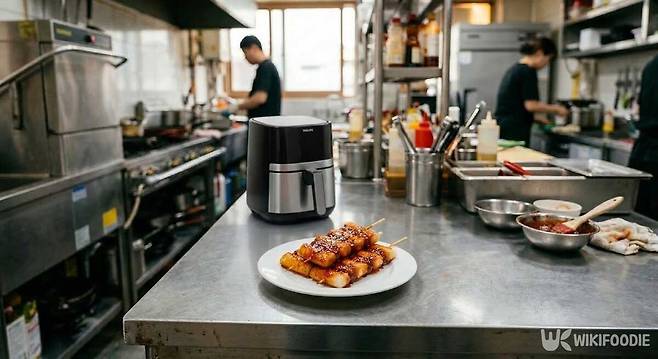 떡을 200도에서 7분 굽고 나서 고추장, 케첩, 설탕을 섞어 만든 소스를 발라주면 포장마차 느낌이 난다. 소스를 바른 뒤 1~2분 더 넣어두면 소스가 떡 표면에 더 잘 붙는다. 여기에 참깨를 살짝 뿌리면 마무리가 깔끔해진다.