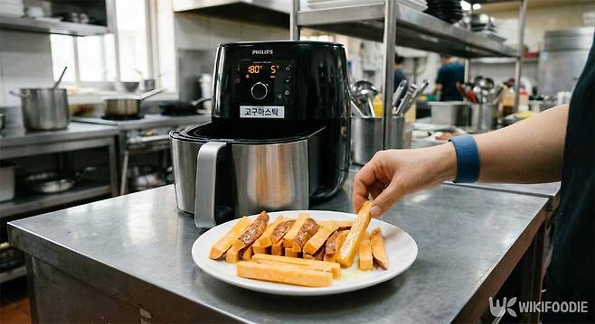 고구마를 물에 10~15분 담가 전분을 빼고 물기를 완전히 닦아낸 뒤 가늘게 썬다. 기름을 얇게 발라 180도에서 15분 조리하면 겉이 바삭해진다. 고구마는 베타카로틴과 식이섬유가 풍부해 다이어트 간식으로 꾸준히 인기를 끌고 있다. 시중에서 파는 고구마스틱 과자와 비교하면 첨가물이 없어 훨씬 가볍게 먹을 수 있다.