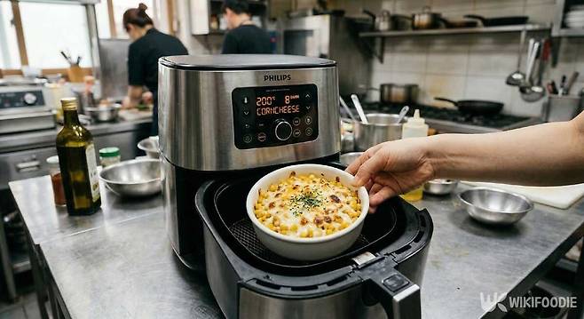 통조림 콘에 치즈, 마요네즈, 설탕을 섞어 용기에 담고 170도에서 10분 조리한다. 치즈가 노릇하게 녹아오르면 완성이다. 옥수수는 식이섬유가 풍부해 소화를 돕는 데 도움이 된다고 알려져 있다. 간단한 술안주로도, 아이들 간식으로도 잘 맞는 메뉴다.