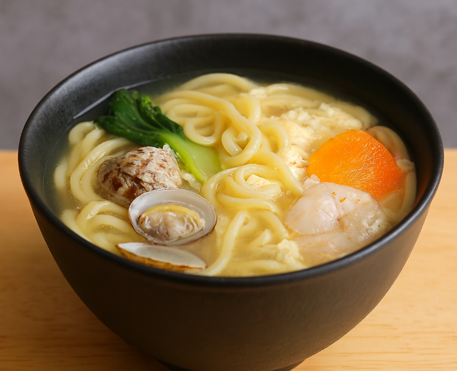 2.같은 냄비에 바지락, 오징어, 야채(얼갈이, 당근, 배추)를 넣고 살짝 데쳐 바로 우동 위에 올립니다.