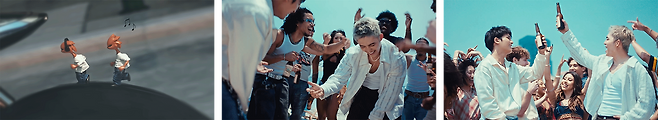 본체 멤버들의 자유로운 일상이 전개됨에 따라 캐릭터들의 몸 또한 선명하게 색칠되기 시작합니다.🎨 달리는 오토바이 바퀴 위에서 음악을 들으며 즐겁게 달리고 있는 쿠테, 만테의 모습은 에스쿱스, 민규의 모습과 매우 닮아 있네요. 이어서 트레일러의 하이라이트라고도 볼 수 있는 해변에서의 댄스 장면🕺입니다! 사람들과 열정적인 시간을 보내며 일상 속 지금을 살아가는 모습을 보여 주는데요. 사람들 틈에서 술을 마시고, 춤을 추고, 분위기를 즐기는 청춘의 모습! 그들의 표정에서는 행복감이 여실히 드러납니다.😆
