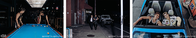 combi 버전의 콘셉트 포토에서는 뜨겁고 강렬했던 낮의 분위기와는 상반된 밤의 이미지🌠를 전달합니다. 가로등이나 신호등 불빛만이 존재하는 밤거리와 뒷골목을 활보하는 그들은 유광 가죽바지와 스타일리시하게 걸친 자켓 등 전체적인 블랙 무드 아웃핏으로 ‘날티’ 바이브를 연출합니다.