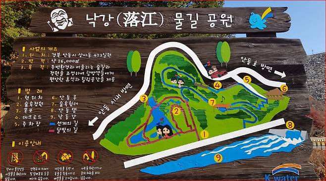 낙강물길공원은 안동댐 수력발전소 입구 좌측, 상아동에 자리해 있어 접근성도 좋습니다. 이곳은 물과 나무가 어우러진 숲길과 정원, 연못과 데크길이 조화롭게 어우러져 있어 사계절 모두 특별한 분위기를 자아냅니다.
