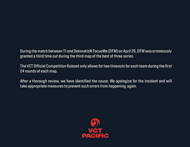 VCT 퍼시픽은 규정상 한 세트 정규 24라운드를 치르는 동안 팀당 최대 2번의 작전 타임을 요청할 수 있지만, DFM 쪽에 한 번의 타임아웃이 더 주어진 것이다.