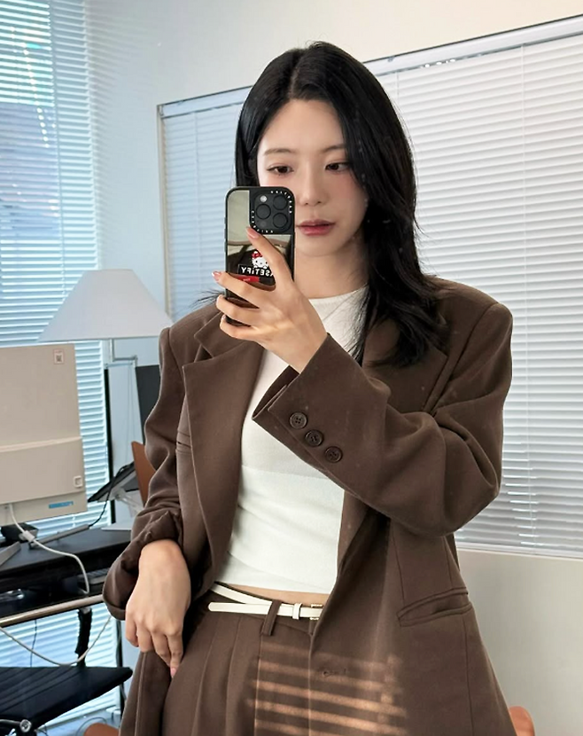 브라운 컬러의 오버사이즈 슈트와 화이트 톱을 매치한 클래식한 룩은 세련된 분위기를 자아내며 많은 팬들의 관심을 끌었다.