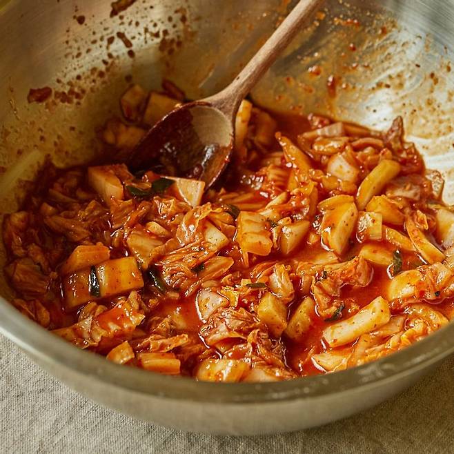 2. 볼에 다진 김치와 양념 재료를 넣고 섞는다.