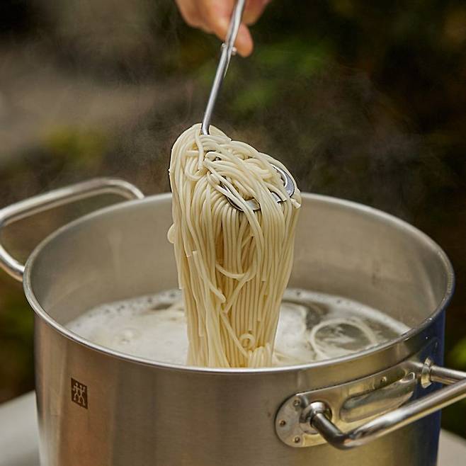 3. 끓는 물에 중면을 펼쳐 넣고 면끼리 달라붙지 않도록 젓는다.물이 끓어오르면 찬물을 2~3회 반복해서 붓는다. 흐르는 찬물에 중면을 여러 번 씻은 후 채반에 밭쳐 물기를 뺀다.