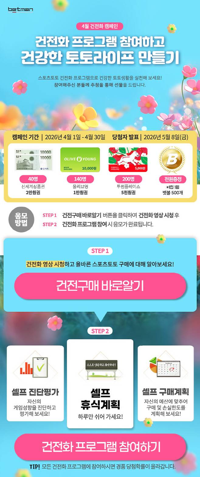 서울올림픽기념국민체육진흥공단이 발행하는 체육진흥투표권 스포츠토토의 공식 인터넷 발매사이트 베트맨이 2026년 4월 건전화 캠페인 '건전화 프로그램 참여하고 건강한 토토라이프 만들기' 이벤트를 오는 30일까지 진행한다고 밝혔다.