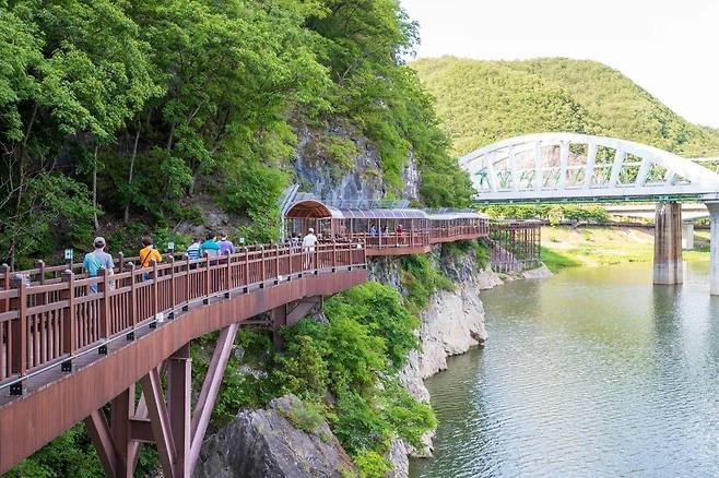 한쪽으로 강물이 잔잔하게 흐르고, 다른 쪽으로 절벽이 병풍처럼 둘러싸여 있어서 걷는 내내 시원한 여름철 트레킹 장소라고 할 수 있죠.