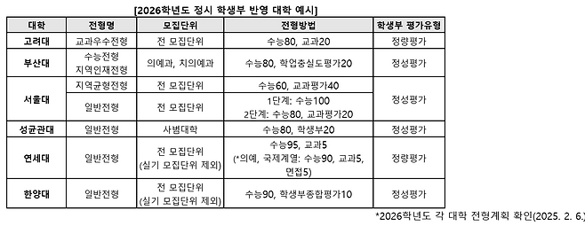 하지만 정시라고 해서 모든 대학이 수능만으로 학생을 선발하는 것은 아니다. 특히 올해는 정시에서 학생부를 반영하는 대학이 더 늘어 주의가 필요하다. 13일 진학사가 2026학년도 정시에서 학생부를 반영하는 주요 대학들을 정리했다.