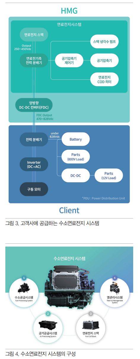 , 화학적 반응에 따라 발생하는 열을 관리하는 TMS4로 구성된다. 이외에도 STACK에서 발생된 전기와 고전압 배터리에서 보관된 전기를 컨버터 및 인버터로 전기를 분배하는 정션박스가 있다. 고객사에 제공하는 연료전지 시스템의 공급 범위는 상기 부품과 FDC를 포함하여 공급하고 있다. 필요에 따라 에어클리너, 이온필터 등을 포함하여 고객사에 제공하기도 한다.