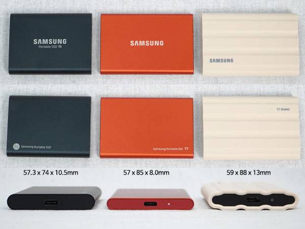 T7 쉴드와 기존 T7 노멀, 그리고 mSATA 기반의 T5를 비교해보면 T5는 길이가 짧은 대신 두께가 더 두껍고 T7은 두께는 얇은 대신 길이가 더 길었는데, 고무 재질의 외부 쉘을 덮은 T7 쉴드는 T7보다 더 길어지고 T5보다 더 두꺼워진 것으로 나온다.