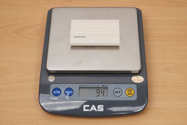 내구성 강화를 위한 고무 재질 외부 쉘이 추가되면서 무게도 그만큼 늘어나 공식 스펙에는 T5(51g)나 T7(58g)보다 무거워진 98g으로 되어 있다. 실제 무게를 측정했을 때는 2TB 모델 기준으로 그보다는 약간 가벼운 94g 정도로 나온다.