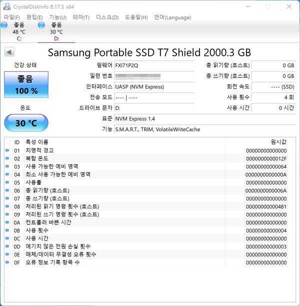T7 쉴드는 USB-C 인터페이스를 지원하므로 윈도우 PC는 물론 안드로이드, Mac, 스마트폰 및 태블릿에서도 사용할 수 있다. CrystalDiskInfo를 통해 SSD 정보를 살펴보면 NVMe 1.4 표준 및 USAP 모드를 비롯해 S.M.A.R.T.와 TRIM, 그리고 터보 캐시 같은 SSD 최적화 기능을 지원하는 것으로 나온다. 신형 모델이어서 그런지 전송 모드가 표시되지 않는다.
