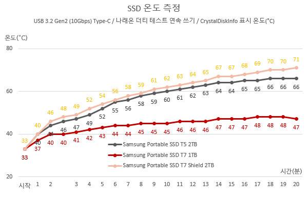 반면, T7 쉴드 2TB는 쓰기 속도가 하락하지 않기 때문에 SSD 온도가 꾸준하게 증가하면서 20분이 경과했을 때 71도까지 올라갔다.