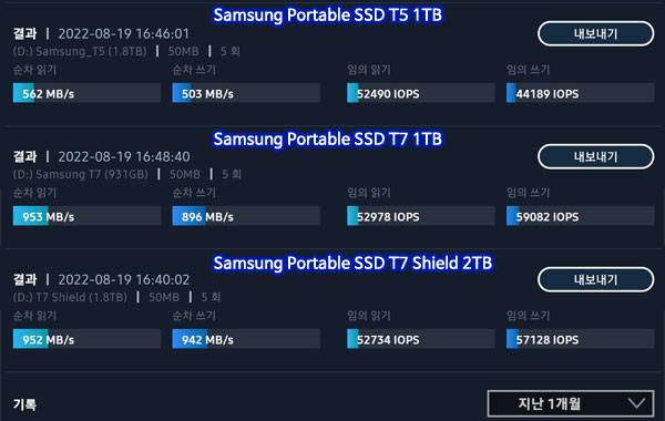 T7 쉴드 2TB 성능 테스트 비교용으로는 필자가 갖고 있는 T5 2TB와 T7 1TB 모델을 사용했다.