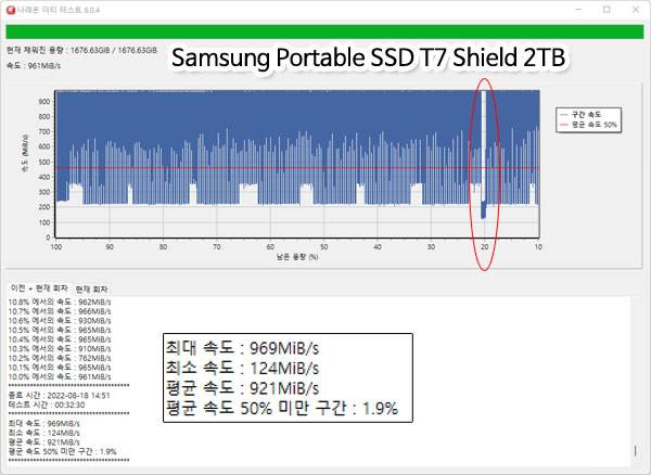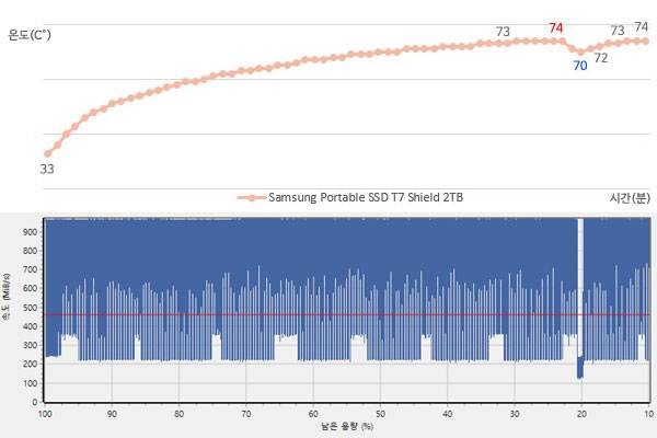 T7 쉴드는 기존 제품들의 문제점으로 지적된 지속 쓰기 성능을 확실히 강화하여 캐시 영역 이후로도 일관된 쓰기 성능을 보여주고 있다. 테스트 마지막까지 최대 쓰기 속도가 900MB/s 중후반을 꾸준히 유지하여 중간에 쓰기 속도 하락으로 시간이 지연되어 테스트를 중단했던 T5 및 T7 노멀과 달리 32분 30초 만에 전체 용량의 90%에 대한 쓰기 테스트를 완료했다.