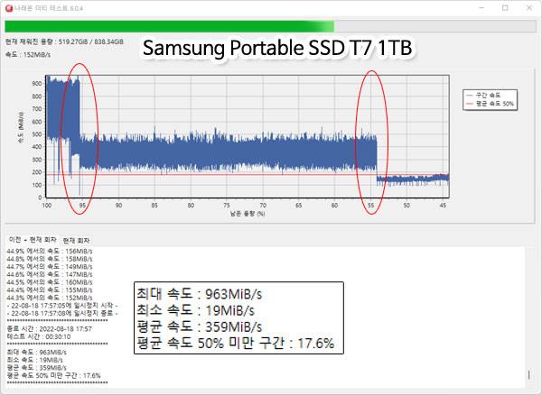 반면 shoppingmode 삼성 T7 1TB는 SLC 캐시 영역에서는 900MB/s 이상의 쓰기 속도로 시작했지만 이후 300MB/s로 쓰기 속도가 급격히 하락했고, 전체 쓰기 용량의 55%를 넘어서자 또 한번 쓰기 속도가 떨어지면서 100MB/s대 중반까지 내려왔다. 최소 속도의 경우 19MB/s까지 떨어지기도 했다.