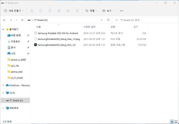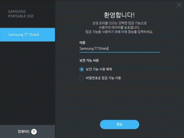 T7 쉴드에 들어있는 shoppingmode 삼성 포터블 SSD 전용 소프트웨어를 설치하면 하드웨어 암호화 기능을 이용한 보안 기능을 활성화하거나, 장치 이름 변경, 최신 펌웨어 업데이트와 같은 작업을 간편하게 할 수 있다.