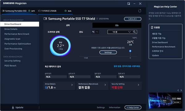 SSD에 담겨있는 삼성 포터블 SSD 외에도 삼성전자 홈페이지에서 무료로 다운로드 가능한 삼성 매지션(Samsung Magician) 소프트웨어를 설치하면 T7 쉴드에 대한 좀더 자세한 정보와 장치 모니터링, 성능 측정 같은 기능도 사용할 수 있다.