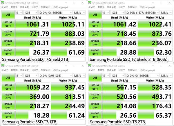 SSD 성능 측정에 널리 사용되는 CrystalDiskMark 테스트 결과 T7 쉴드 2TB 모델의 순차 읽기/쓰기 속도는 공식 스펙을 만족시키는 성능을 보였으며, 전체 용량의 90%가 채워진 상태에서도 성능 하락이 없는 것으로 나왔다.