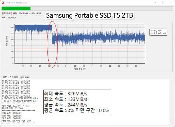 shoppingmode 삼성 T5 2TB는 전체 용량의 약 90%에 대한 쓰기 테스트를 시행했을 때 약 4.5% 정도에 캐시 영역의 쓰기 속도가 작용하고, 이후에는 평균 쓰기 속도가 200MB/s대 초중반으로 떨어졌지만 비교적 안정적인 쓰기 속도를 유지하면서 약 20분간 테스트를 했을 때 평균 속도 50% 미만 구간은 전혀 없는 것으로 나타났다. 최소 속도도 133MB/s 이하로는 내려가지 않았다.