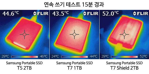 실제로 나래온 더티 테스트 약 15분 경과 후 FLIR 열화상 카메라로 외장 SSD 온도를 측정한 결과 알루미늄 케이스가 외부로 노출되고 캐시 영역 이후 쓰기 속도가 하락한 T5와 T7은 외부 온도가 비슷했지만, 고무 재질 외부 쉘이 덮여있고 쓰기 속도가 하락하지 않은 T7 쉴드는 52도까지 올라간 것으로 나타났다.