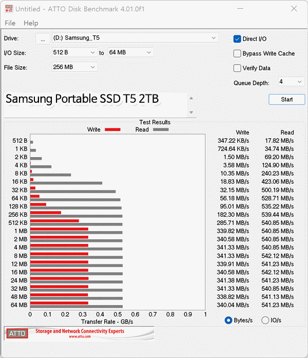 ATTO 벤치마크의 경우 CrystalDiskMark에 비해 쓰기 속도가 낮게 측정되었는데, T7 쉴드 2TB는 그 와중에 성능 하락폭이 다른 제품들보다 적어 실제 제품 스펙과 근접한 결과를 보여주었다.