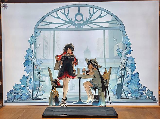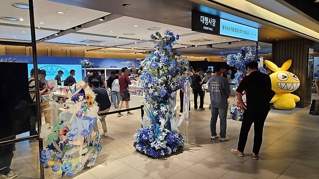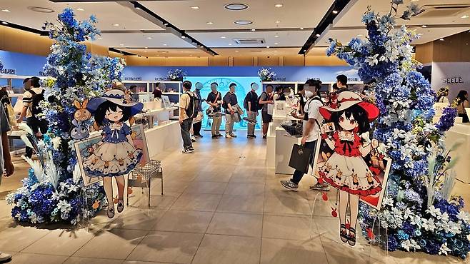 현대백화점 천호점에서 개최된 붕괴3rd 가을 팝업스토어는 붕괴3rd의 죽음과 생명의 율자 '제레'를 테마로 꾸며져 있습니다. 파란색 꽃과 나비가 팝업스토어 곳곳을 장식하고 있고, 다양한 모습의 제레를 담은 대형 판넬이 여기저기 세워져 있죠. 특히, 제레가 게임에서 튀어나온 듯한 코스튬 플레이어도 볼 수 있었습니다. 제레의 두 가지 인격을 완벽하게 표현하고 있는데요, 붕괴3rd 팬이라면 현장에 방문해 그 모습을 눈에 직접 담아두는 걸 추천하고 싶을 정도입니다.