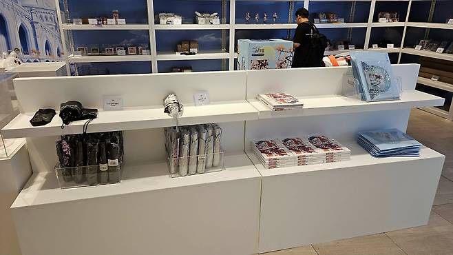 굿즈판매존 전경. 매대는 벽면과 중앙으로 구분되어 있습니다.