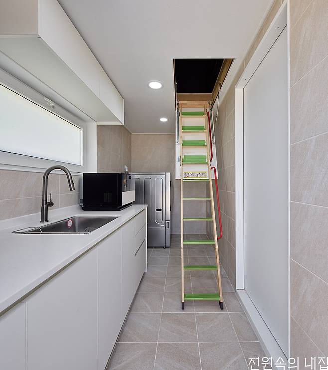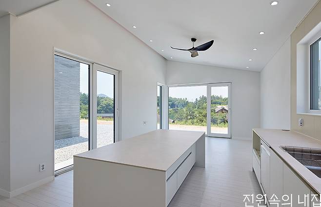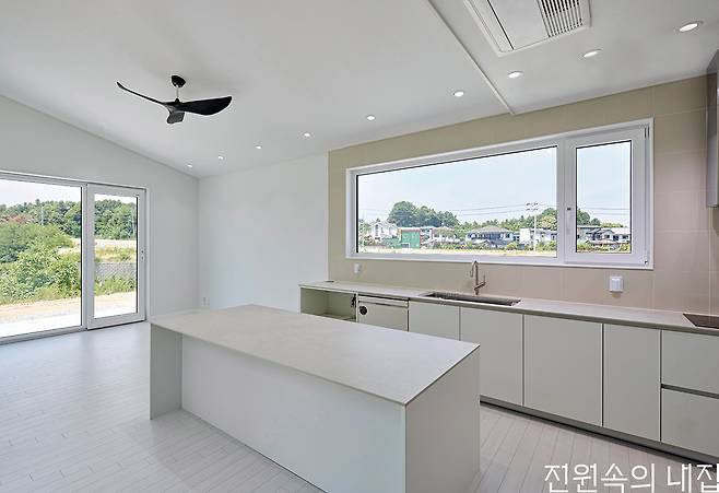 내부 인테리어는 깔끔함을 기본으로 하되 필요한 곳마다 포인트를 두었다. 가장 많은 시간을 보내는 주방과 욕실에 중점을 두어 고급스러움과 편리함을 극대화했다. 주방에는 이태리산 세라믹 타일을 사용해 상판과 아일랜드를 마감해 줬다. 세련미와 고급감을 더하면서도 내구성으로 관리의 이점까지 가져간다. 매일 사용하게 될 공간이기에 기능성과 심미성을 모두 고려한 결과다. 욕실 또한 이태리산 고급제품을 구입해 수전과 액세서리를 설치했다. 욕실을 사용하게 될 건축주 부부의 피부에 직접 닿는 제품들이었기에, 디자인적인 만족감과 자재 안정성까지 고려해야 했다.