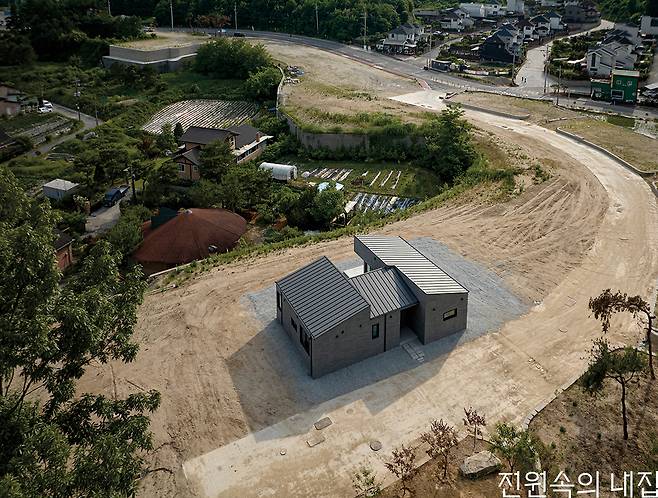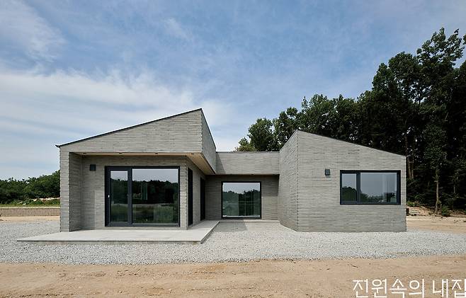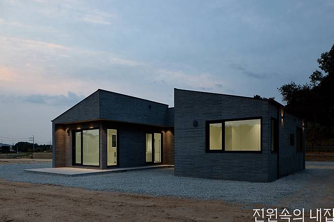 제한된 예산이 초기에 설정되었기에 비용 절감을 위한 효율적인 자재 사용과 공간 구성이 핵심이 됐다. 필요 이상의 넓은 공간이나 복층 구조는 제외하고, 실용성과 편암함을 극대화하는 데에 집중했다. ‘ㄷ’자 형태 설계의 중심에는 중정이 자리 잡고 있다. 중정의 너머로는 강이 보이는 풍경을 넓은 유리창을 통해 누릴 수 있어 대지가 가진 장점을 훌륭하게 살려냈다. 내부의 구조는 중정을 중심으로 서쪽에는 거실과 부엌을, 동쪽에는 방과 욕실을 배치했다. 각 공간은 독립적이면서도 유기적으로 연결되며 부부의 생활에 불편함이 없도록 만들어준다. 특히 거실과 주방은 넓고 개방감 있게 설계되어 가족과 친구들을 초대해도 충분한 공간을 제공한다. 완성된 주택은 건축주의 생활에 딱 맞는, 30평이 채 안 되는 소형 주택이다. 그레이 톤의 벽돌 타일과 어두운 색의 지붕이 중후한 매력을 줌과 동시에, 유지·관리면에서도 경제성을 갖추었다. 또한 주택 단지에 첫 번째로 자리 잡은 집이기에 이후 들어설 주택들의 기준점이 되어준다는 의의도 있다.