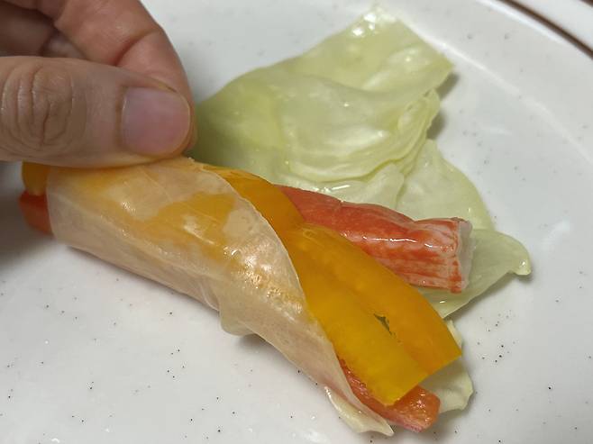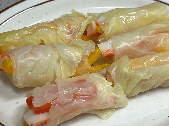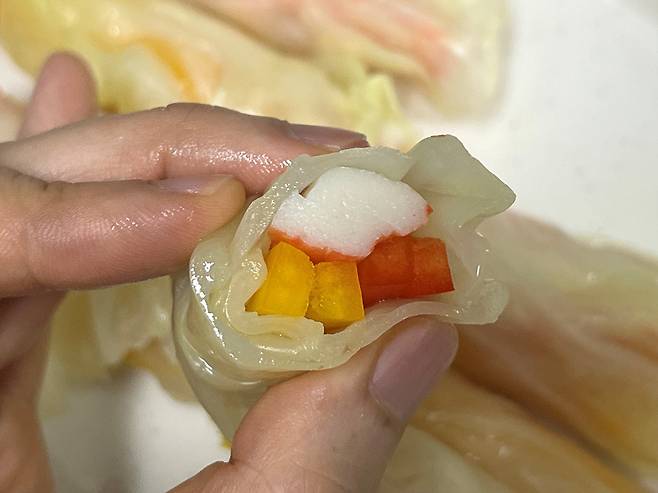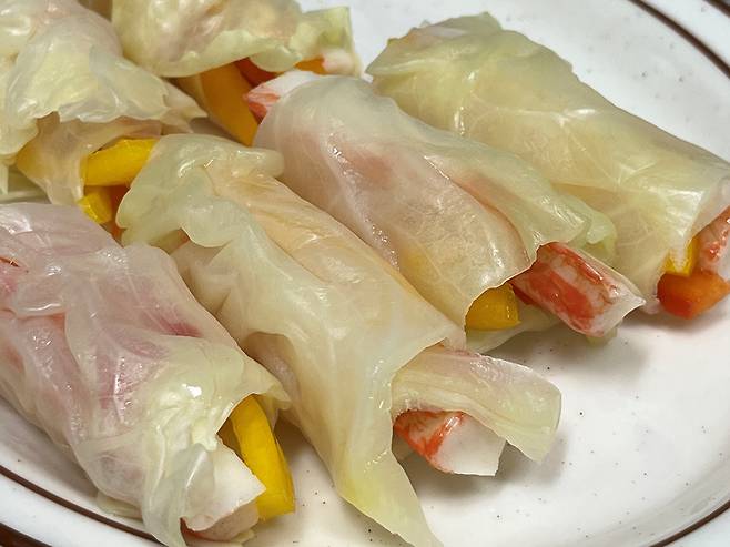 양배추 끝 부분을 잡고 돌돌 말아주세요. 크래미 대신 소고기나 닭고기 등을 넣어도 잘 어울립니다.