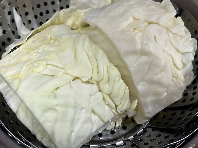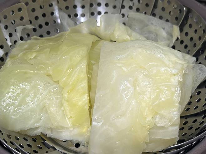 양배추는 깨끗한 겉잎 위주로 떼어낸 후 물에 한 번 헹구세요. 두꺼운 심지가 있는 안쪽보다는 얇고 두께가 고른 겉잎이 말기 좋고 식감도 부드럽습니다. 찜기에 넣어 약 5분 삶으세요.