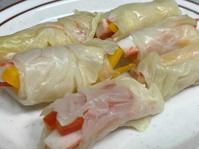 같은 방법으로 양배추에 속재료를 넣어서 말아 주시면 됩니다. 쉽지만 눈으로 보기에도 예쁘고 맛까지 좋은 메뉴입니다.