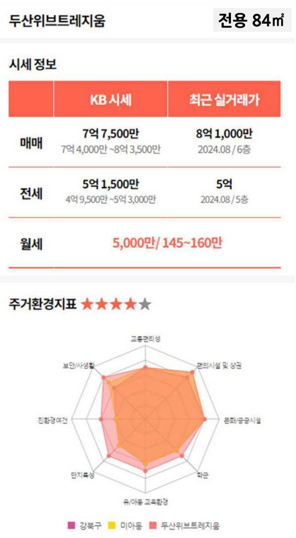 서울시 강북구 미아동 내 KB시세 상승율은 4.11%(3위), 최근 1년간 매매거래량 46건(3위)으로 거래가 활발하다 할 수 있으며 전세 거래량도 116건(3위)으로 많은 편이다.