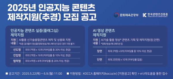 다음 달 9일까지 'AI 콘텐츠 제작 지원사업'에 참여할 기업과 대학(산학협력단), 공공기관(박물관·미술관) 등을 추가로 공모한다. 이번 추가 공모는 2025년 1차 추경으로 편성된 165억원을 투입해 추진한다. ‘인공지능 콘텐츠 실증 제작’ 36편, ‘인공지능 영상 제작’ 18편 등 총 54개 과제를 선정해 지원에 나선다.