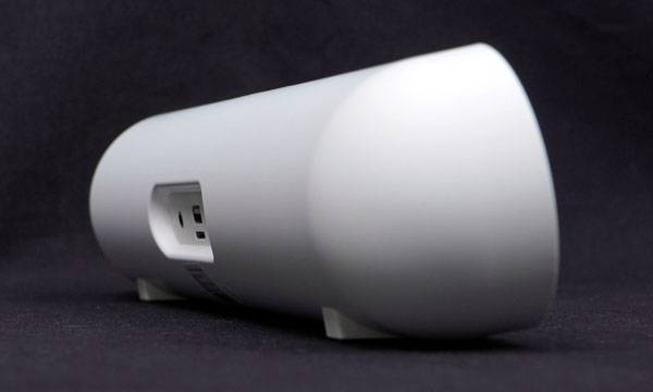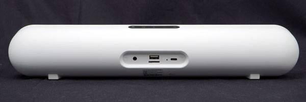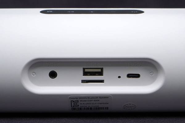 스피커 후면에 위치한 입출력 포트는 좌측부터 3.5mm AUX 입력 단자와 USB 포트, TF 카드 슬롯, 그리고 USB Type-C (USB-C) 형태의 DC 5V 전원 입력 단자로 구성된다. USB-C 포트 옆에 있는 전원 LED는 충전 중에는 빨간색, 충전이 완료되면 파란색으로 표시된다.