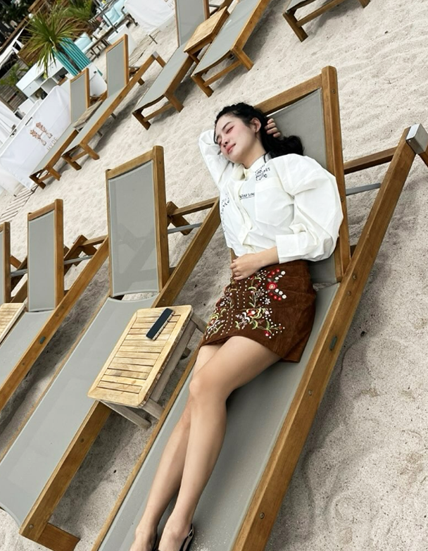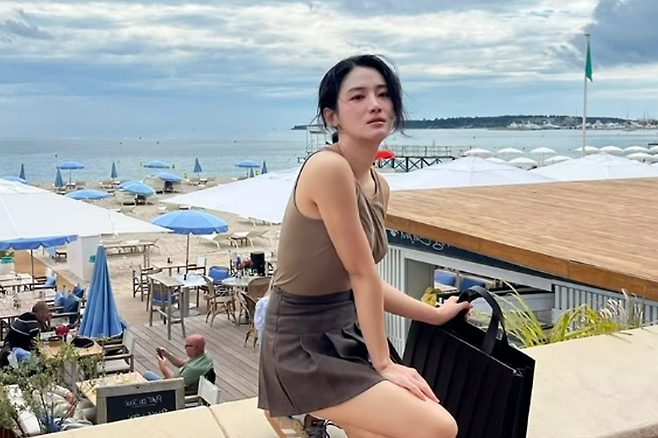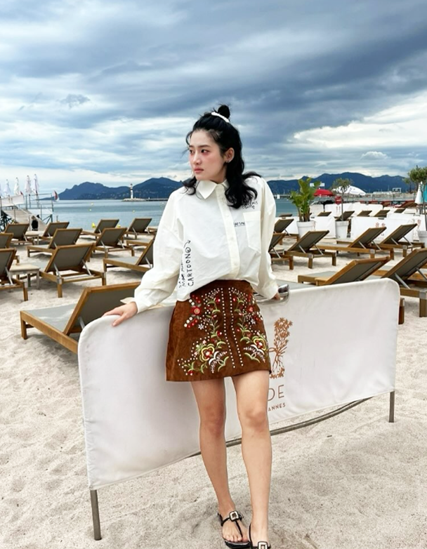 바다를 배경으로 한 비치 화보에서는 자수 디테일의 브라운 스커트와 아이보리 셔츠를 조화롭게 매치해 자연스럽고도 이국적인 무드를 선보였다.