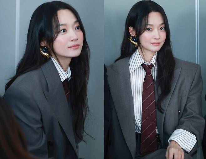 신민아는 클래식한 스트라이프 셔츠에 와이드한 그레이 슈트를 매치하고, 굵은 와인 컬러 타이로 포인트를 줘 시크한 오피스 룩을 완성했습니다.