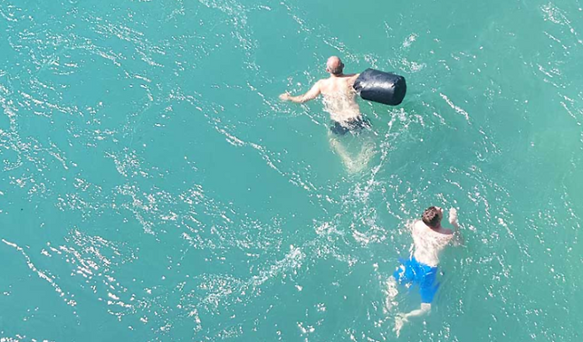 퇴근 시간, 베른의 한 관청이나 회사에서 일하던 직장인이 업무를 마치고 강변으로 향한다. 강가의 탈의실이나 간이 공간에서 옷을 갈아입고, 소지품은 100% 방수 기능이 있는 ‘수영 가방(Dry Bag)’에 넣는다. 이 방수 가방은 입에 빨대를 물 듯 바람을 불어넣어 부풀린 뒤 입구를 봉하면, 물 위에 완전히 뜨기 때문에 일종의 ‘미니 튜브+짐가방’이 되는 셈이다.