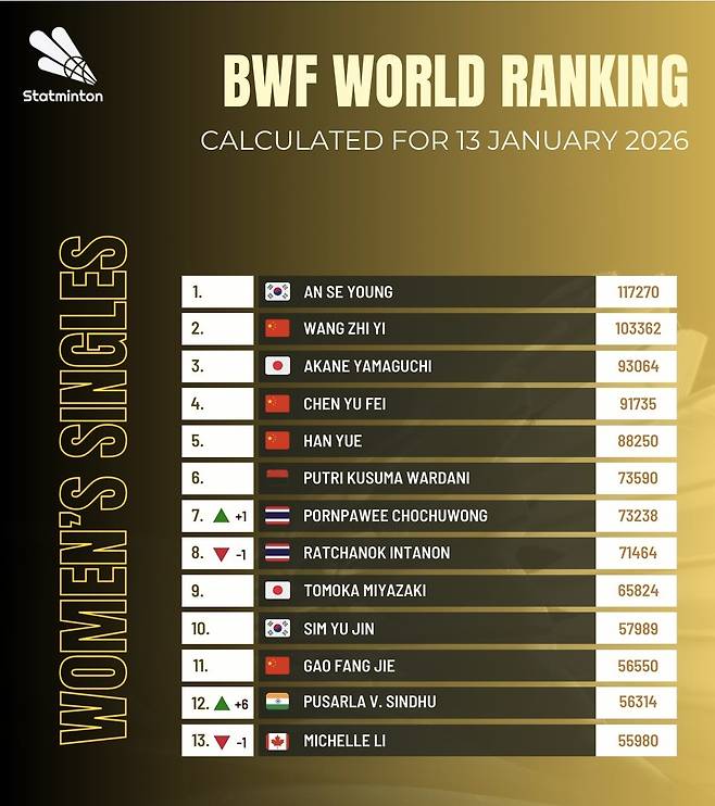배드민턴 팬들 사이에서 가장 공신력 있는 지표인 GOAT 랭킹은 올림픽, 세계선수권, 아시안게임 등 메이저 대회 성적과 세계랭킹 1위 유지 기간 등을 포인트로 환산한 커리어의 총합이다. 안세영의 2026년 시작은 그야말로 공포스럽다. 시즌 첫 메이저 대회인 말레이시아 오픈(슈퍼 1000)과 이어진 인도 오픈(슈퍼 750)에서 안세영은 모두 결승에 진출, 세계 2위 왕즈이를 연달아 제압하며 2주 연속 우승컵을 들어 올렸다. 이로써 왕즈이와의 상대 전적은 18승 4패(최근 10연승)까지 벌어졌다. 2025년 94.8%의 역대급 승률을 기록했던 안세영은 2026년 시작과 동시에 '무패 행진'을 달리며 수산티의 기록을 맹렬하게 추격 중이다.