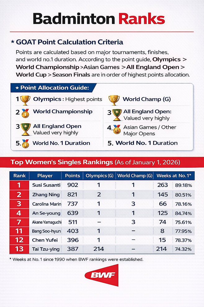 본 기사에 인용된 'GOAT(Greatest Of All Time) 포인트'는 전 세계 배드민턴 전적과 통계를 전문적으로 다루는 데이터 플랫폼인 BadmintonRanks(badmintonranks.com)의 분석 지표를 바탕으로 합니다.