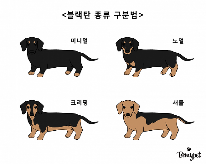 블랙탄은 검정색과 황갈색(탄) 털의 비율에 따라 총 4가지 종류로 나눠져요. 미니멀 탄, 노멀 탄, 크리핑 탄 그리고 새들로 구분합니다.