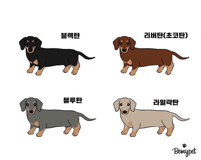 검은색 털이 다갈색(검은빛이 섞인 갈색)으로 나타난 경우 리버탄(Liver Tan) 혹은 초코탄, 회색인 경우 블루탄(Blue Tan) 그리고 블루탄보다 더 옅어지면 라일락탄(Lilac Tan)이라고 불러요.